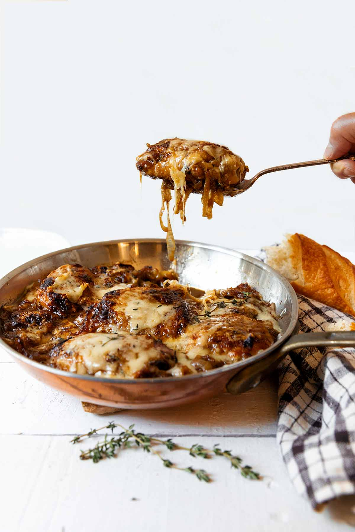 This skillet chicken is a mash-up of French onion soup—beef broth, bread, tons of caramelized onions, and a wicked lot of cheese—with skillet-seared chicken thighs. Simple and amazingly good.